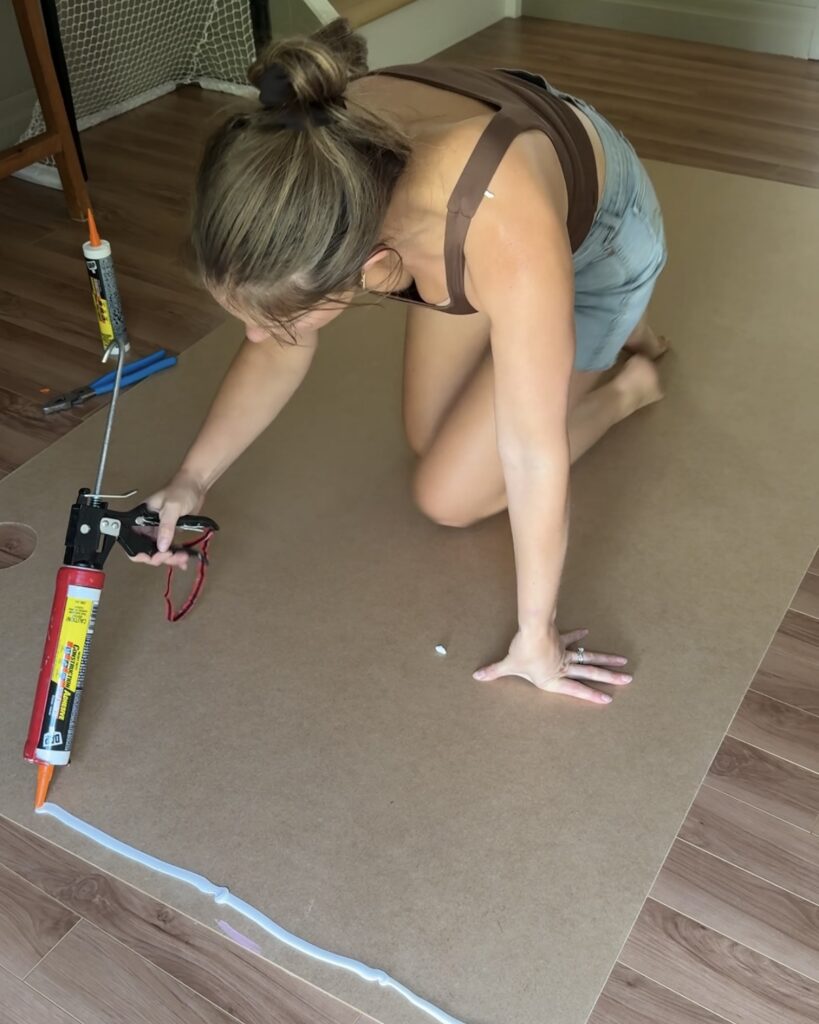 Since I couldn’t use nails or screws on the brick, I relied on DAP Heavy Duty Construction Adhesive Max Strength to secure the hardboard panels in place. This adhesive is incredibly strong, making it the perfect solution for a project like this.